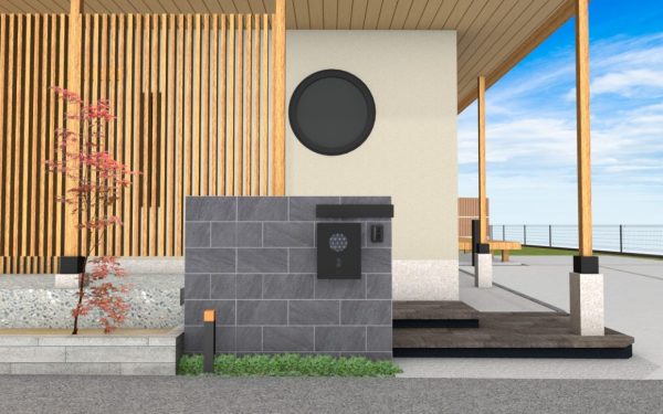建物の丸窓とリンクして、ポストも和テイストの丸窓デザインが採用されました。照明は明るすぎないタカショーの粋シリーズを。蠟燭を灯したような暖かい色です。